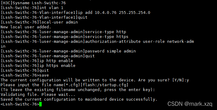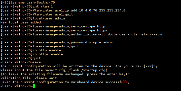 [Lssh-Swithc-76-luser-manage-admin]password simple admin --------设置用户密码为:admin[Lssh-Swithc-76-luser-manage-admin]quit --------退出当前设置[Lssh-Swithc-76]ip http enable --------开启http[Lssh-Swithc-76]ip https enable --------开启https[Lssh-Swithc-76]quit --------退出当前设置<Lssh-Swithc-76>save --------保存设置